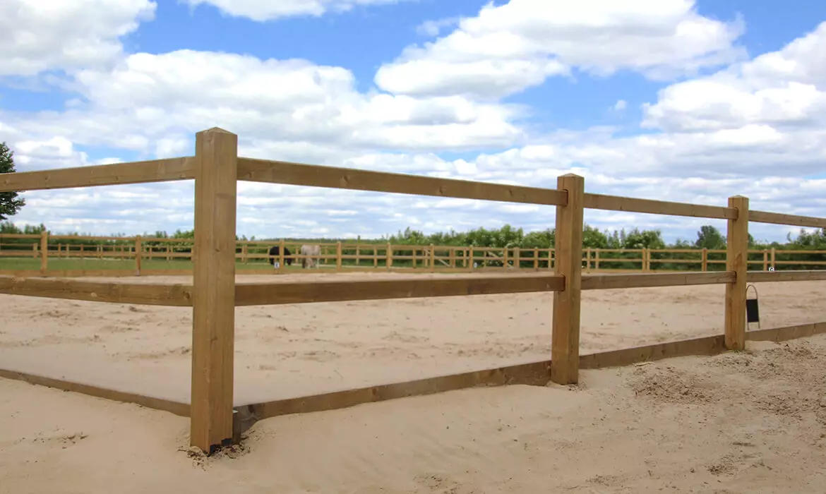 Für einen Kunden in den Niederlanden konnten wir ein wahres „Paddock-Paradies“ verwirklichen. Dieser Paddock ist mit unserem robusten Weidezaun mit 2 Bretter ausgestattet. Außerdem haben wir einen Reitplatzzaun von 20 x 40 Meter mit einem Abschlussbrett aufgestellt. Neben dem Reitplatzzaun befindet sich eine große Gras-Koppel, die geschlossen werden kann. Rund um den Reitplatz und dem Graspaddock gibt es einen breiten PAddock Trail, auf dem die Pferde uneingeschränkten Zugang zu Heu haben. Dies gibt den Pferden genügend Platz für ausreichende Bewegung. Der Holzzaun ist mit Tanalith-E imprägniert, um die Lebensdauer zu verlängern.