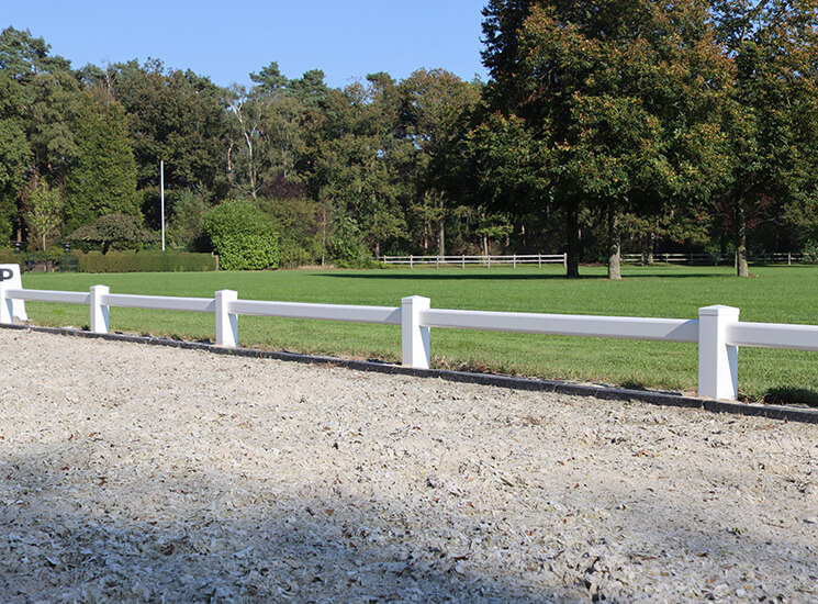 Dieses Dressurviereck aus Kunststoff ist eine feste Reitplatzumrandung, die durch die Diamantköpfe auf den Pfosten sehr stilvoll ist und durch den Einsatz von sehr stabilem PVC eine lange Lebensdauer verspricht. Die Dressurplatz-Umrandung ist somit repräsentativ, sicher, langlebig und erfordert wenig Wartungsarbeiten.