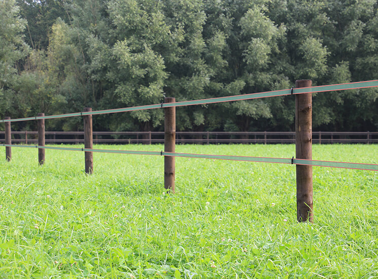 Dieser Elektro Weidezaun Pferde wird mit 2 Reihen verstärktem Breitband, Isolatoren und Pfosten geliefert. Die Pfosten sind in 3 verschiedenen Imprägnierungen erhältlich. Diese Rundpfosten sind mit DURA² imprägniert, um die Lebensdauer des Holzes zu verlängern. Dieser Elektrischer Zaun ist auch mit 3 Reihen grünem Breitband erhältlich.