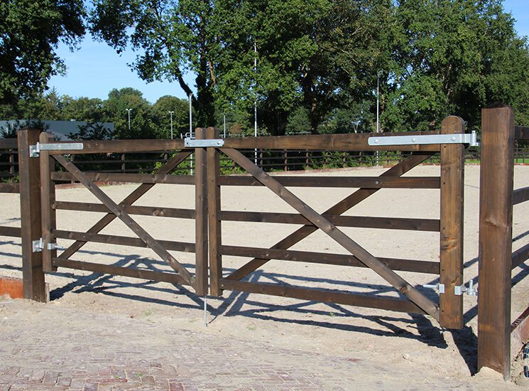Das englische Holztor hat einen schrägen oberen Balken. Dies sorgt dafür, dass das Gewicht des Weidetors besser verteilt wird und es daher weniger wahrscheinlich ist, dass es schief hängt. Für einen schönen englischen Country-Look sind die Holztore mit einem Kreuz versehen. Auch die Balken des Tores sind komplett gehobelt, was dem englischen Holztor ein schlichtes und luxuriöses Finish verleiht.