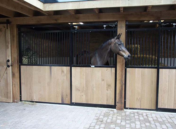 Diese Pferdebox „Gentleman“ ist mit einer Schiebetür, einer Futteraussparung, schwarzer Pulverbeschichtung und 32 mm Eichenbrettern ausgestattet. Der Gentleman ist auch mit einer Drehtür erhältlich.