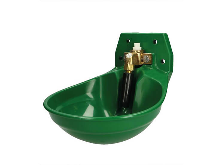 Robuster Tränkebecken mit regulierbare Rohrventil zur Vermeidung von Wasserverschwendung. Hochwertige Tränkebecken aus Aquathan Kunststoff in der Farbe grün.