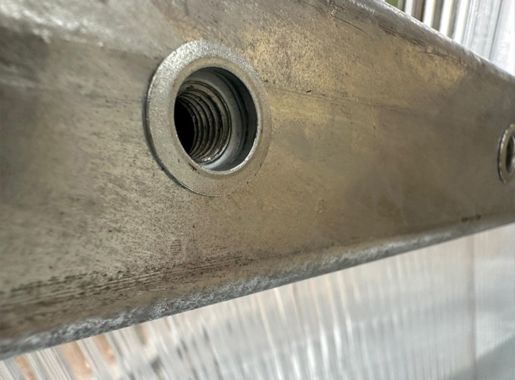 Die Stahlpfetten verfügen über sauber verarbeitete Verbindungen zu den Sparren, wobei geschnittene Gewinde verwendet wurden. Dies sorgt nicht nur für eine moderne Optik, sondern auch für eine stabile und langlebige Konstruktion.