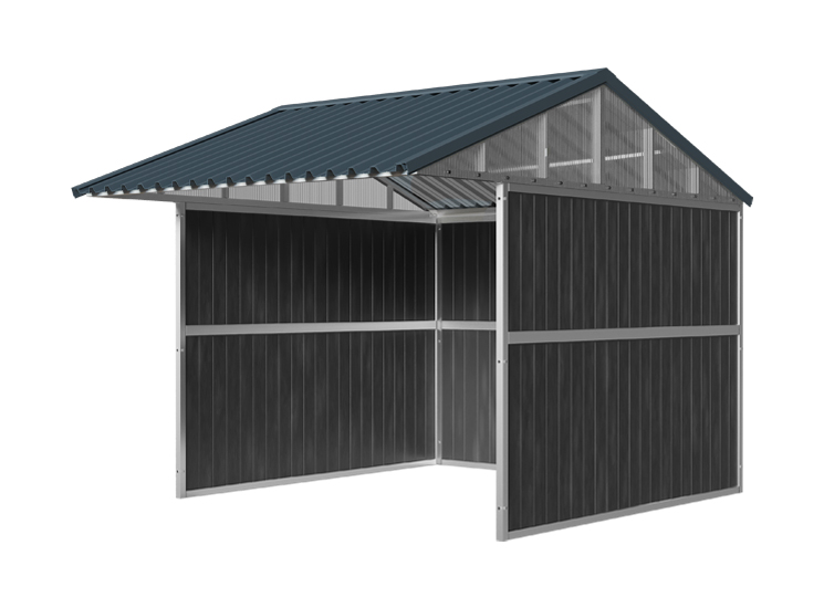 Die Weidehütte wird mit recycelten Kunststoffbohlen in der Farbe Schwarz oder Braun geliefert. Standardmäßig ist die Weidehütte mit Trapezprofilblechen mit Vliesbeschichtung an der Unterseite des Daches ausgestattet. Dieses Vlies sorgt für die Aufnahme von Kondenswasser und trägt zu einem angenehmen Innenklima bei. Optional können isolierte Sandwichpaneele gewählt werden. Diese sind empfehlenswert, um im Sommer die Wärme zu reduzieren und wirken zudem schalldämmend bei Regen oder sogar Hagel.