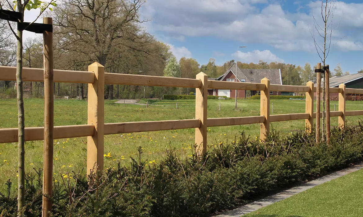 Unseren Eichenzaun sehen Sie hier im neuen Look. Dieser robuste Eichen koppelzaun hat standardmäßig rechteckige Pfosten.
