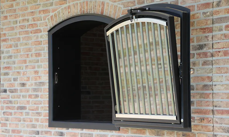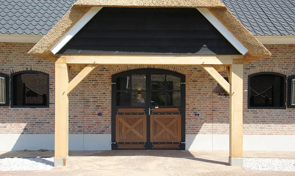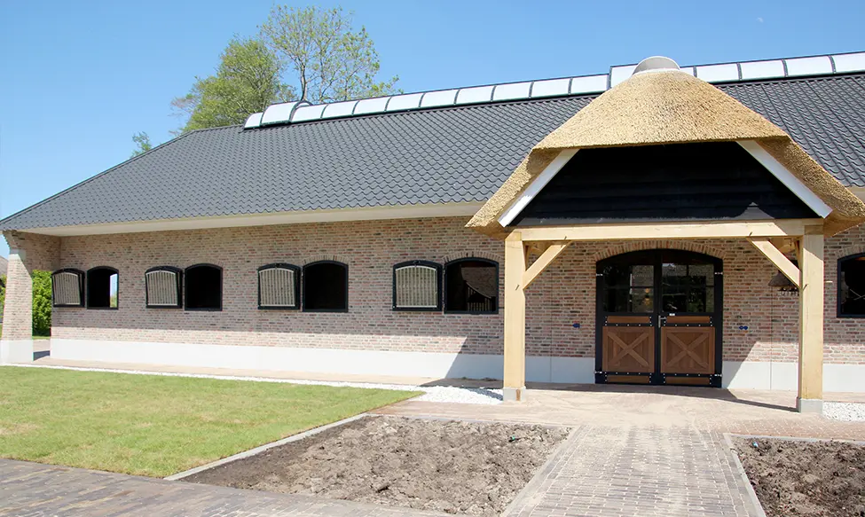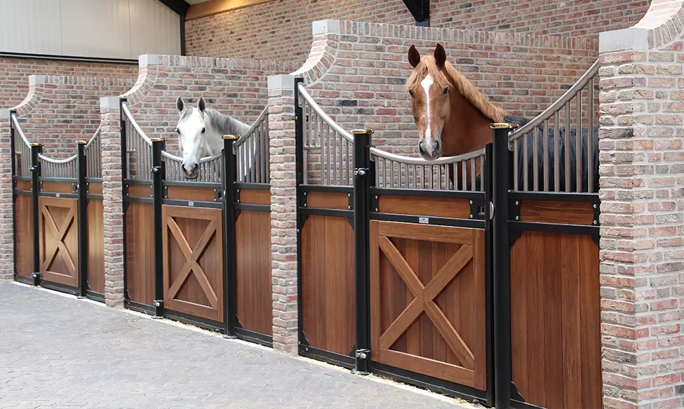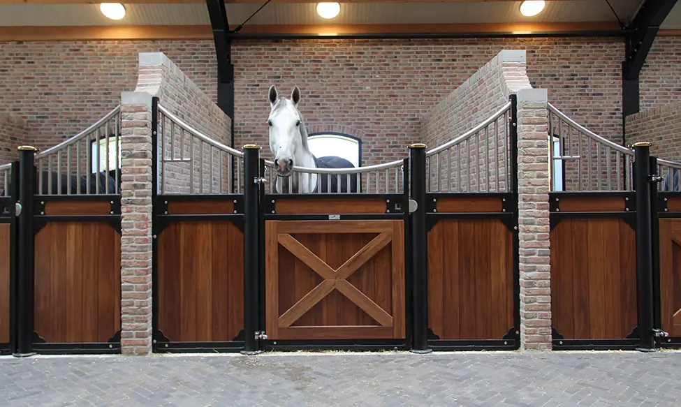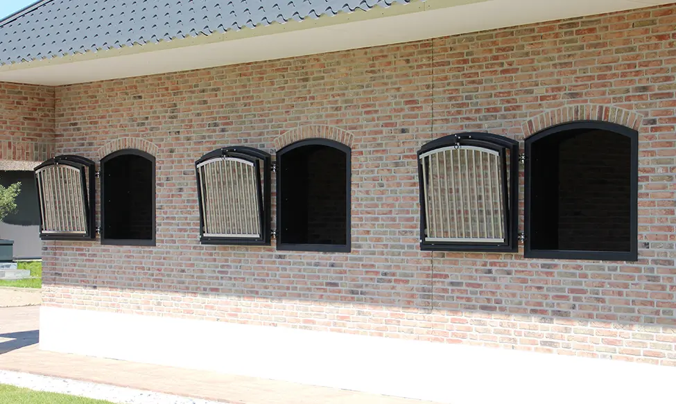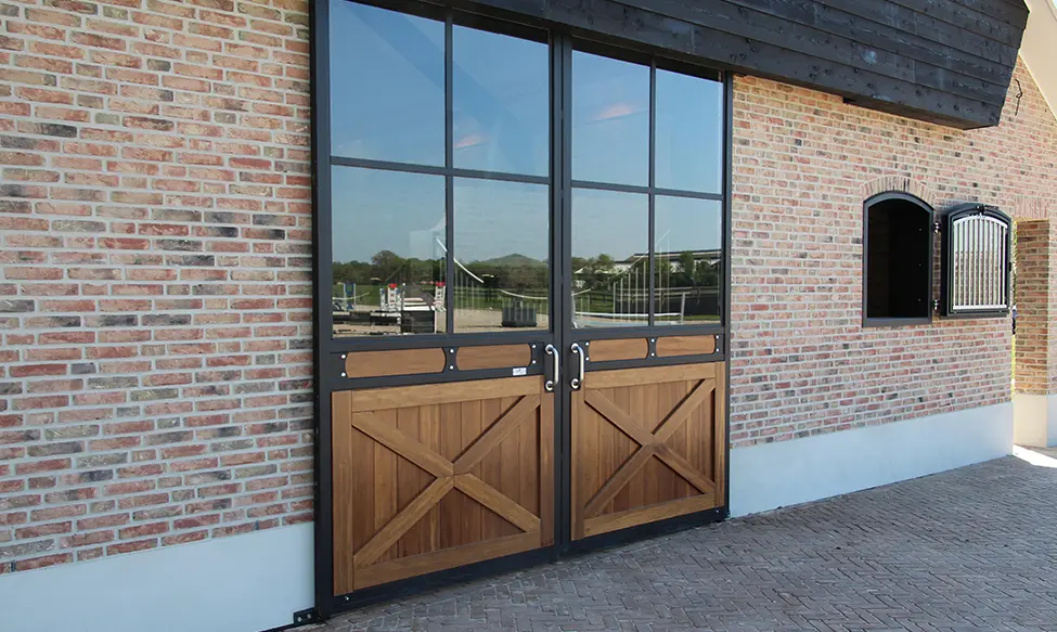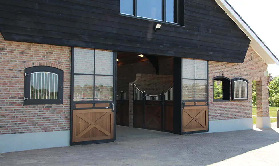 Die Pferdeboxen sind jeweils mit schönen großen Fenstern ausgestattet, so dass auch die Pferde den Blick nach draußen genießen können. Die Fenster haben sowohl eine Dreh- als auch eine Kippfunktion und können daher das ganze Jahr über für frische Luft in den Ställen genutzt werden. Für das gleiche luxuriöse Aussehen sind die Stallfenster pulverbeschichtet, mit Stichbogen und mit Edelstahlsprossen versehen. Um die Fenster leicht reinigen zu können, sind die Gitterstäbe abnehmbar. Die beiden großen Schiebetüren am Anfang und am Ende des Stallflurs lassen viel Licht herein. In den Sommermonaten können die Türen auch für eine schöne frische Brise im Stall geöffnet werden. Die Türen sind ebenfalls pulverbeschichtet und die Bambusbretter sorgen für das gleiche luxuriöse Aussehen an der Außenseite des Stalls.
