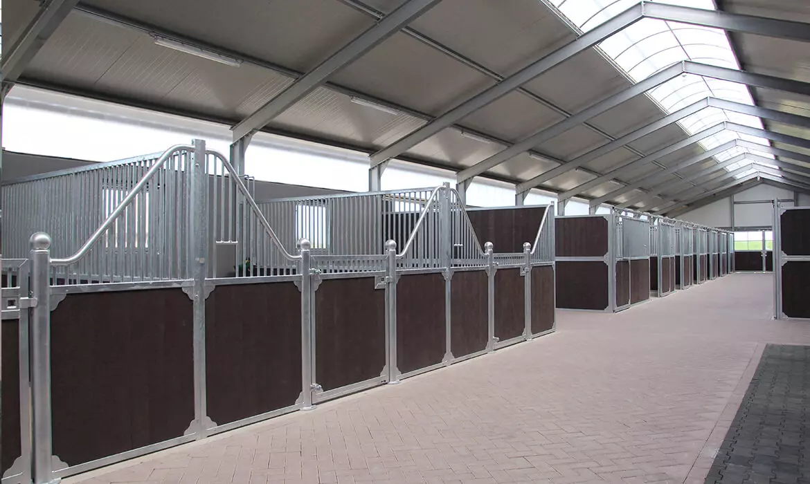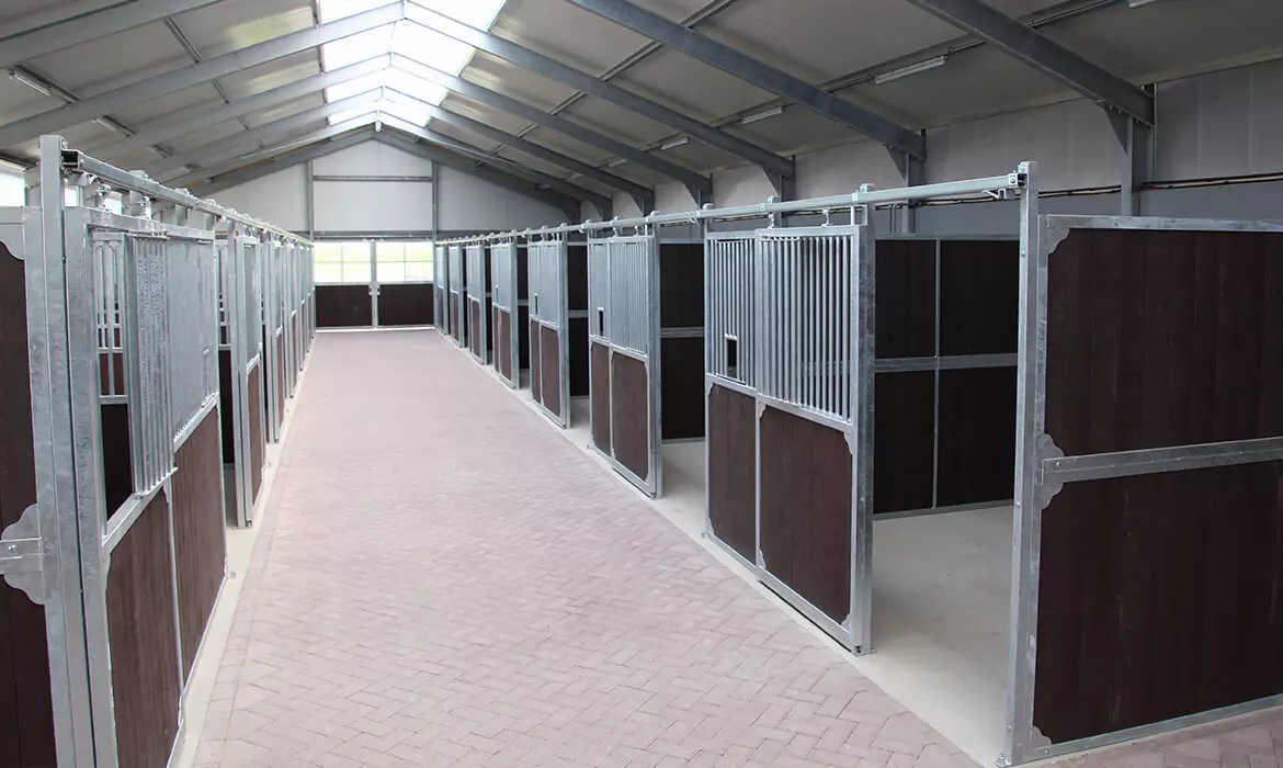 In der Mitte des Stalls befinden sich die Reinigungs- und Waschbereiche, die mit unseren Waschplatz Trennwänden ausgestattet sind. Die Sattelkammern sind mit geschlossenen Stalltüren ausgestattet, die auch verschlossen werden können. Der Stall wirkt aufgrund der Kombination der großen Pferdestalltüren, der Gentleman Pferdeboxen und der Oxford Stallwände luxuriös.
