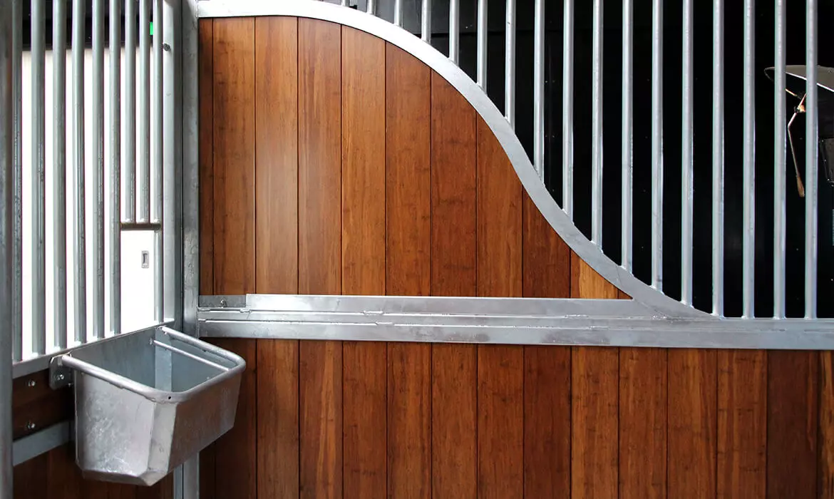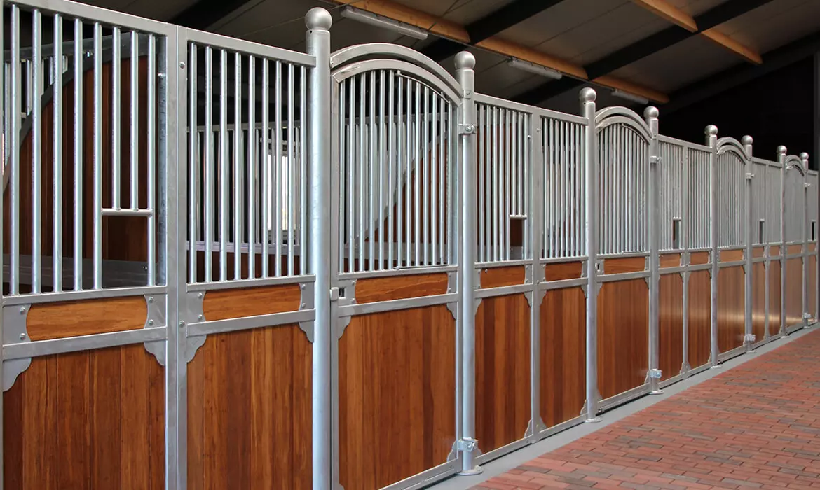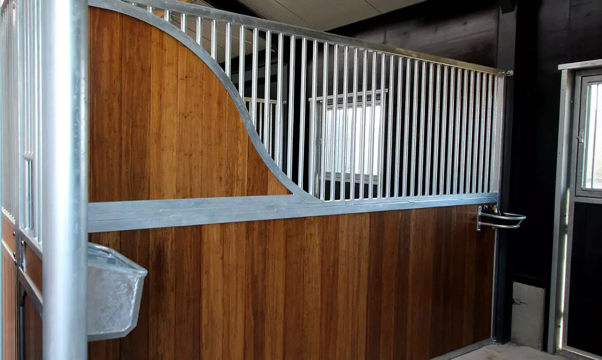 Diese luxuriösen Stallwände befinden sich in einer wunderschönen Lage in einem Naturschutzgebiet in der Nähe von Arnhem. Die Eigentümer haben selbst die komplette Scheune gebaut, die einen ländlichen Charakter hat. Auf jeder Seite des Korridors befinden sich nicht weniger als 5 luxus Pferdeboxen. Die Trennwände sind mit einem S-Bogen versehen, so dass ein Teil der Wand geschlossen ist. Dies verkürzt die Fütterungszeit und sichert dennoch den gegenseitigen sozialen Kontakt.