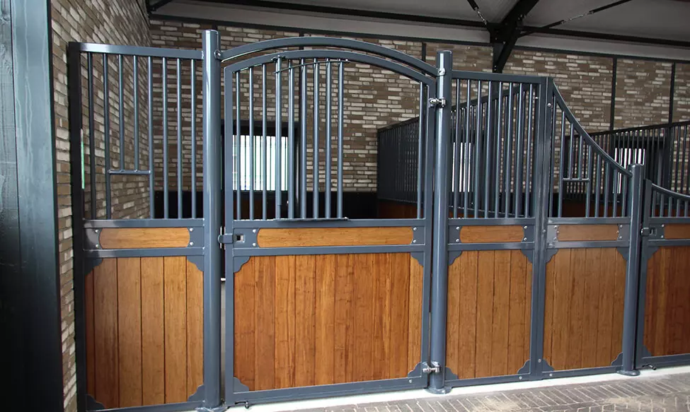 Diese „Cambridge“-Pferdeboxen haben ein klassisches Design und zeigen in diesem Projekt, dass sie gut mit den „Birmingham“-Vorderwänden kombiniert werden können. Der Kunde hat für dieses Projekt den „Cambridge“ aufgrund der pferdefreundlichen Möglichkeit für soziale Kontakte und des schönen Designs ausgewählt. Für eine eventuelle Hengsthaltung wurden zwei hohe Vorderwände eingebaut, die sich übrigens perfekt in das Ganze einfügen. Es wurde ein Wandschutz aus Gummi gewählt. Die Front- und Trennwände sind mit einer schönen grauen Pulverbeschichtung, Bambusbretter und einem horizontalen Brett versehen.